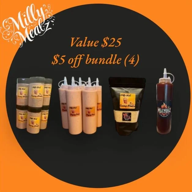 MILLY MEALZ hand crafted sauces, signature seasoning, and merch.